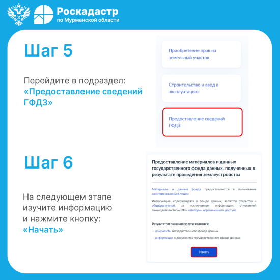 Подать заявление на получение материалов можно с помощью портала «Госуслуги» в разделе «Документы → Недвижимость → Все услуги → Предоставление сведений ГФДЗ → Предоставление материалов и данных государственного фонда данных, полученных в результате проведения землеустройства».