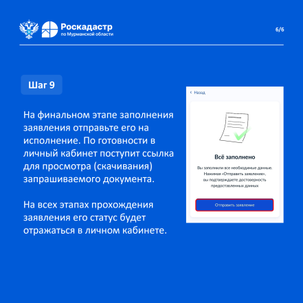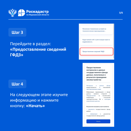 Дополнительную информацию о порядке предоставления услуги можно уточнить у специалистов филиала ППК «Роскадастр» по Мурманской области по телефону: 8 (8152) 40-30-00, 40-30-17, доб. 2507, 2508, 2395, и по электронной почте: filial@51.kadastr.ru.